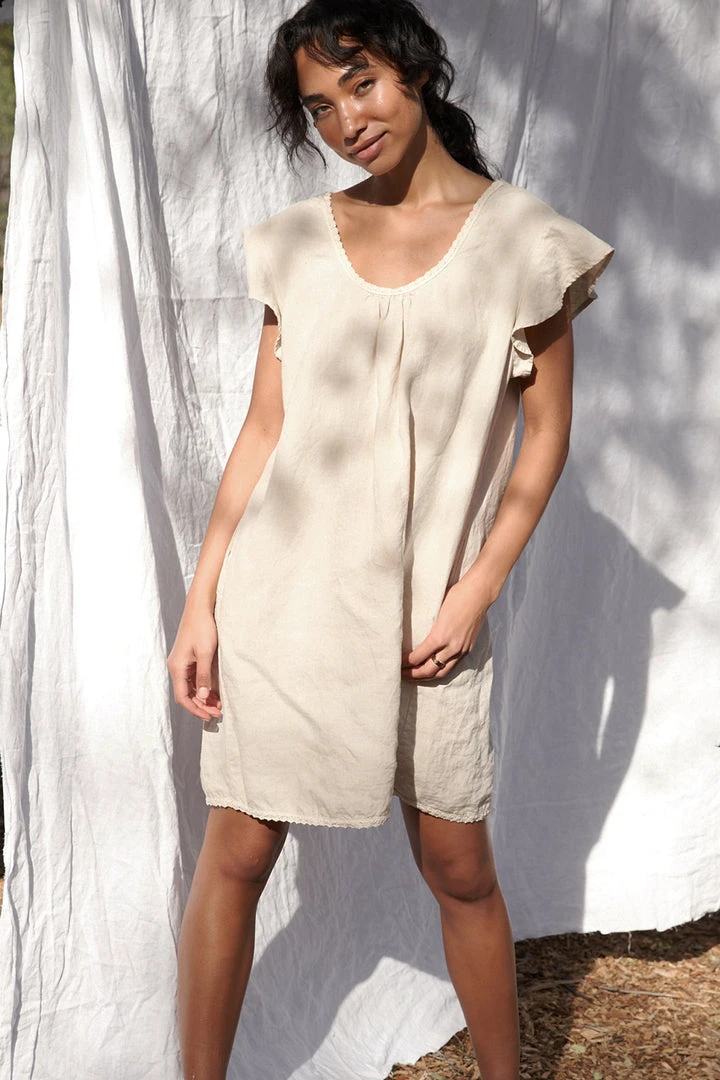 This dreamy silhouette features practical hip pockets and fluttery sleeves. Trimmed with a natural cotton lace around the hem and neckline and accented with delicate gathering. This dress is cut generously for comfort, perfect for layering and hazy days.