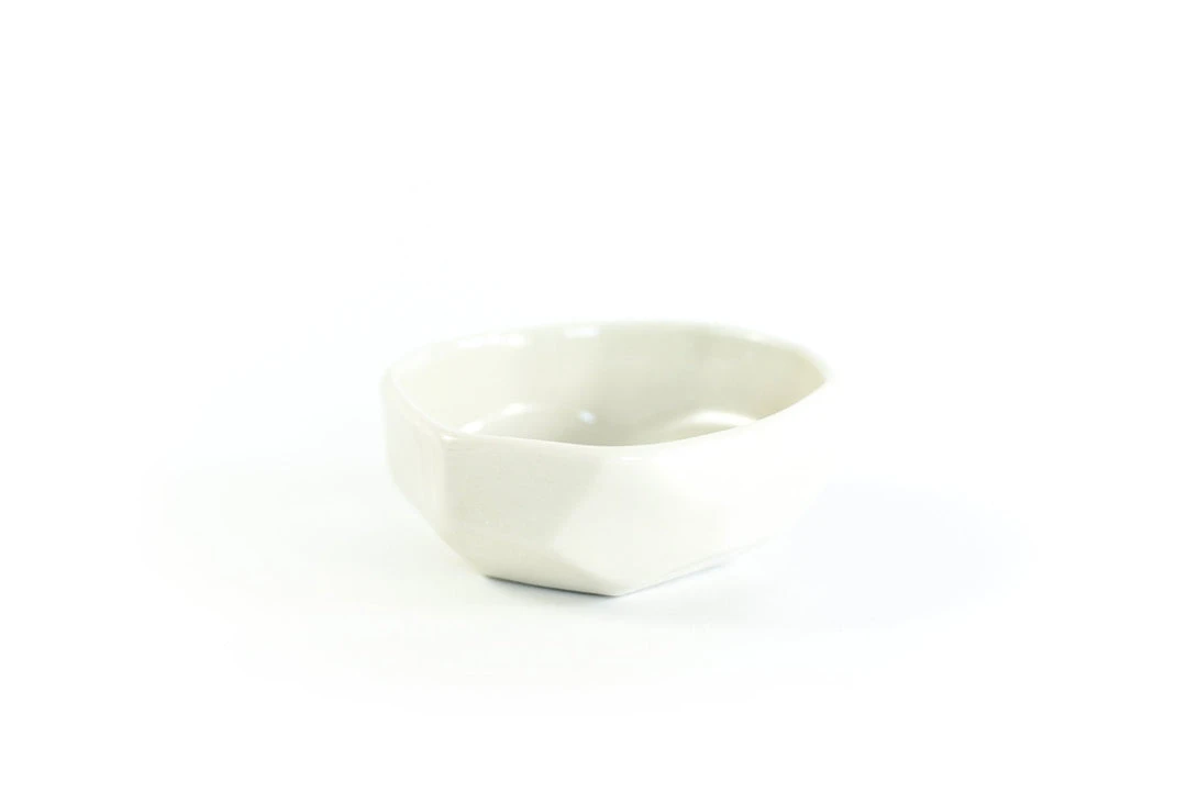 The Bevel Series takes its influence from gemstone cuts. These faceted bowls elevate any dining experience. Nest them together on a tabletop when not in use to showcase their sculptural presence. This bowl is slip cast using porcelain slip, then dipped in glaze and fired to Cone 6.