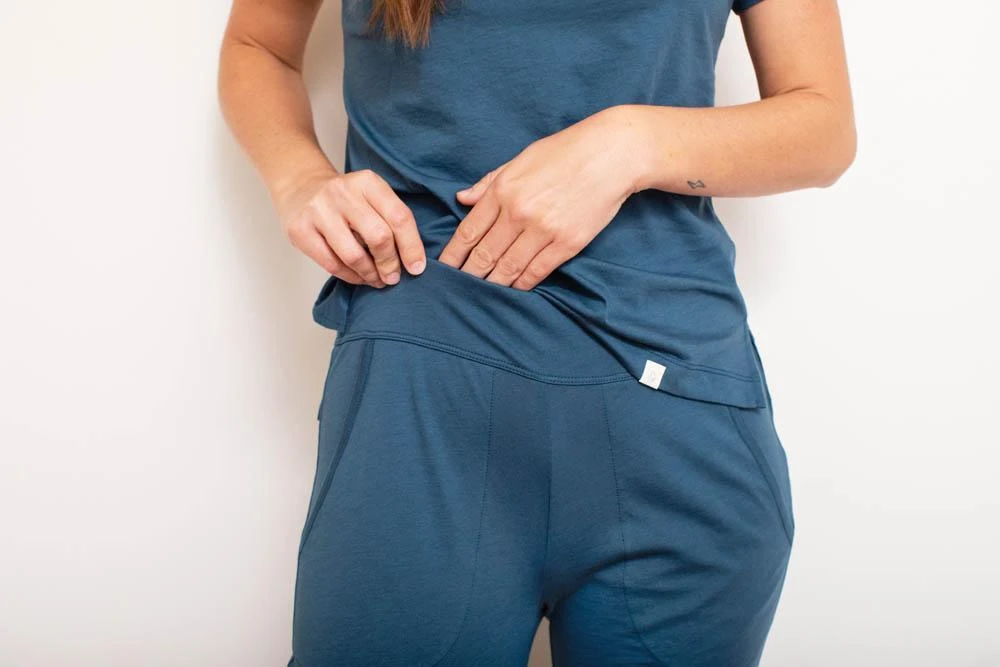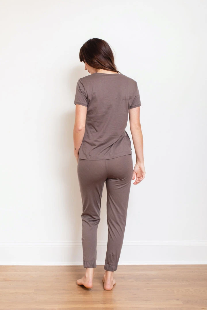 This soft, organic t-shirt and matching joggers bottom make this pajama set a dream for lounging or sleeping. The jogger-style bottoms are tapered at the ankles. Model wears size XS.