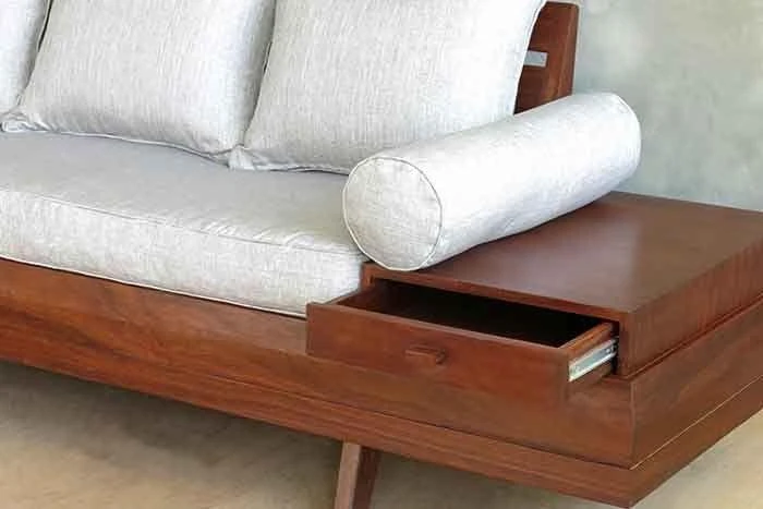 This bohemian floating sofa makes a stylish, casual, and chic addition to your entertaining and living areas. Its incredibly solid and tasteful handmade hardwood construction shows off unique joinery while the built-in end surfaces make a convenient place to place a book.