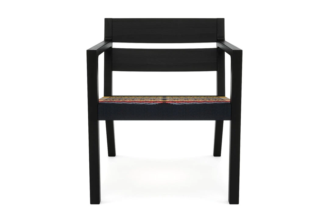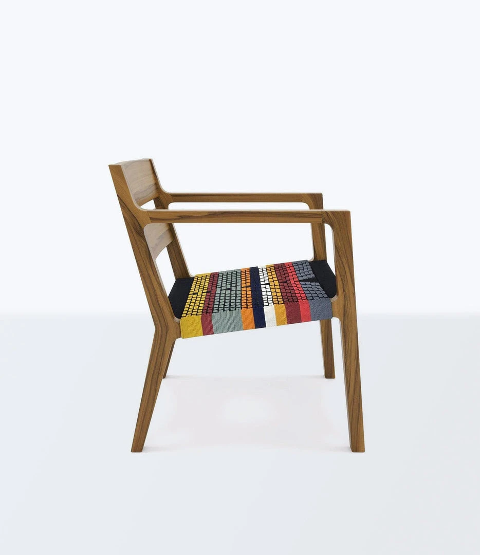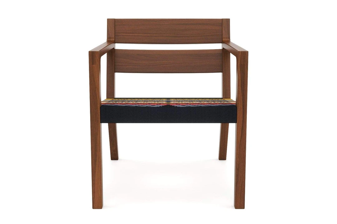 Managua Arm Chair in the San Geronimo pattern features a handwoven manila seat and a solid hardwood frame and backrest. Artisanal woodworking technique and modern styling make this armchair versatile. Available in Teak, Mahogany, Walnut and Burnt Teak.
