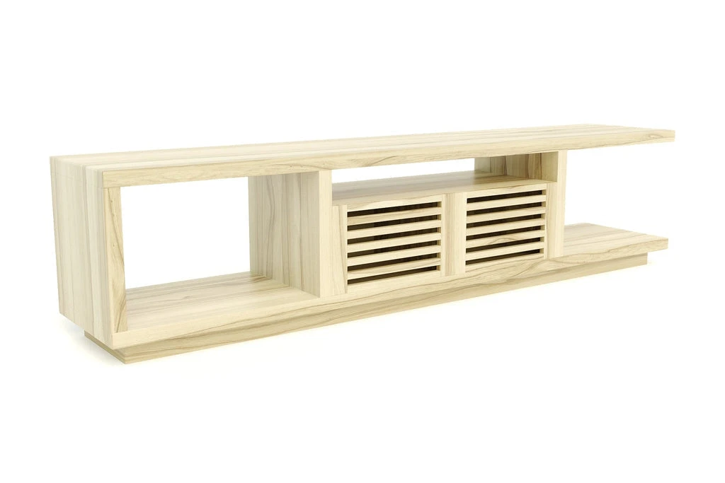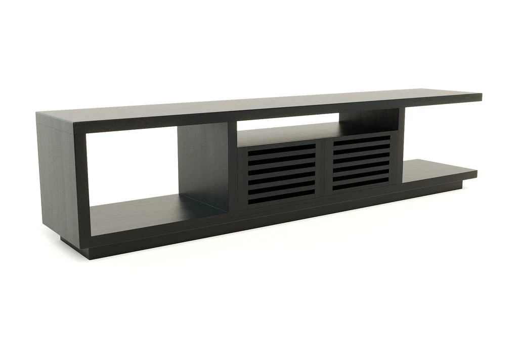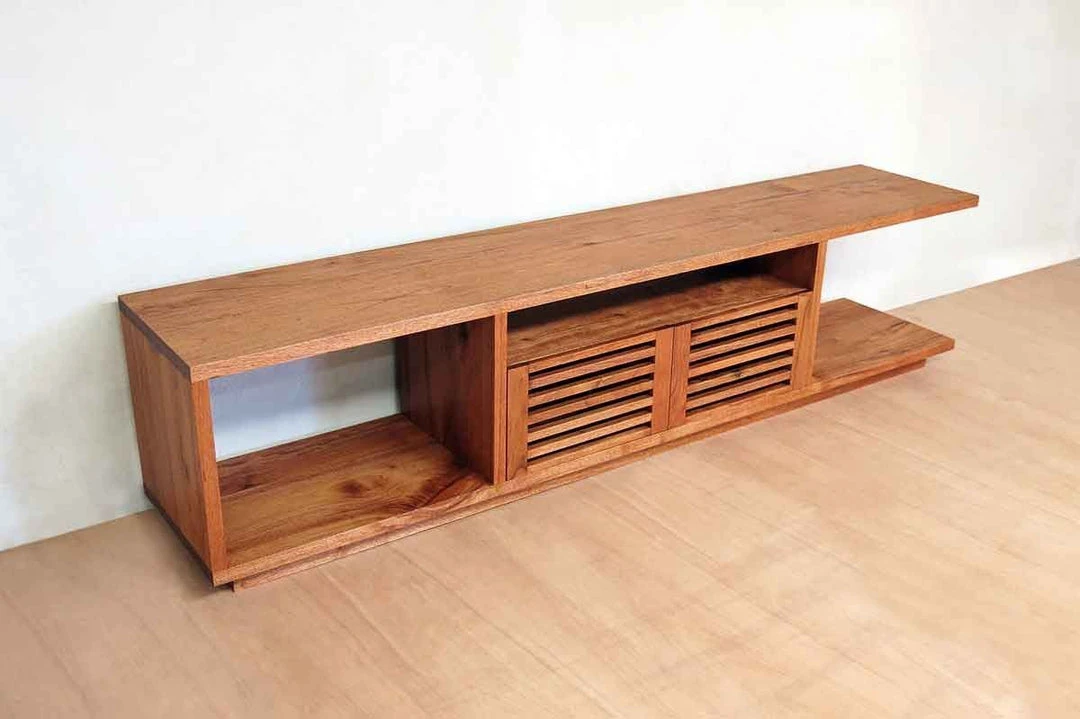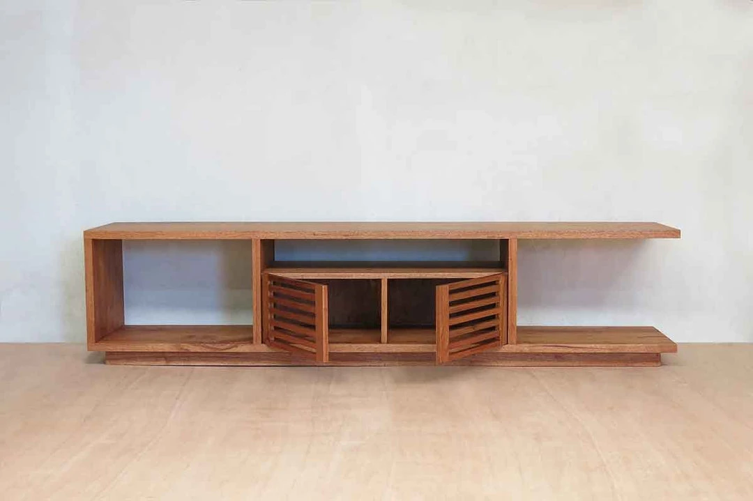 This modern wood TV console is both stylish and incredibly well built. This piece comes fully assembled and is built entirely from solid sustainably harvested tropical hardwood.