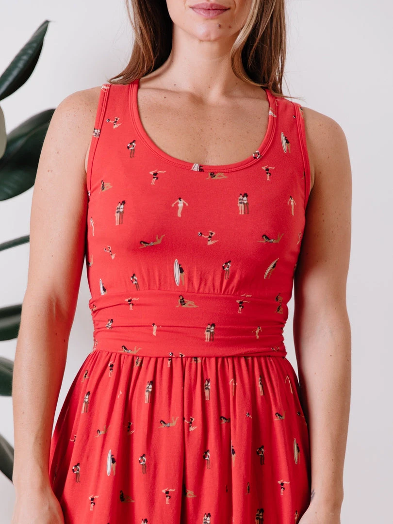This fit and flare tank dress lets you enjoy the beach even if you are stuck inside. This celebration of swimmers, sunbathers, and surfers features organic cotton jersey, hidden pockets, and a ruched waistband for a flattering fit.
