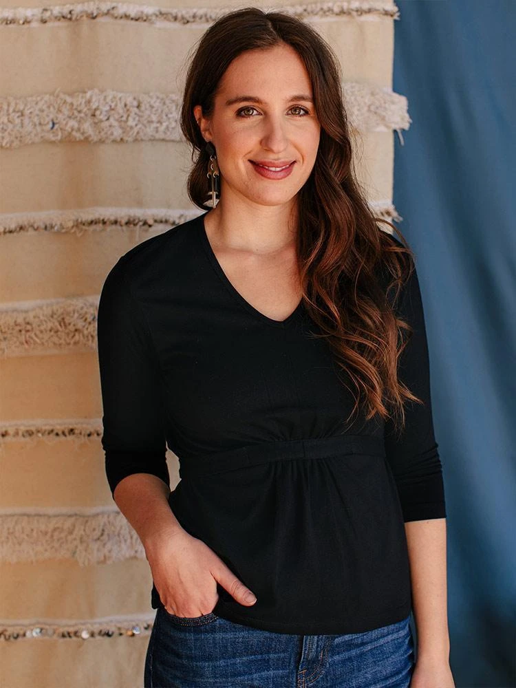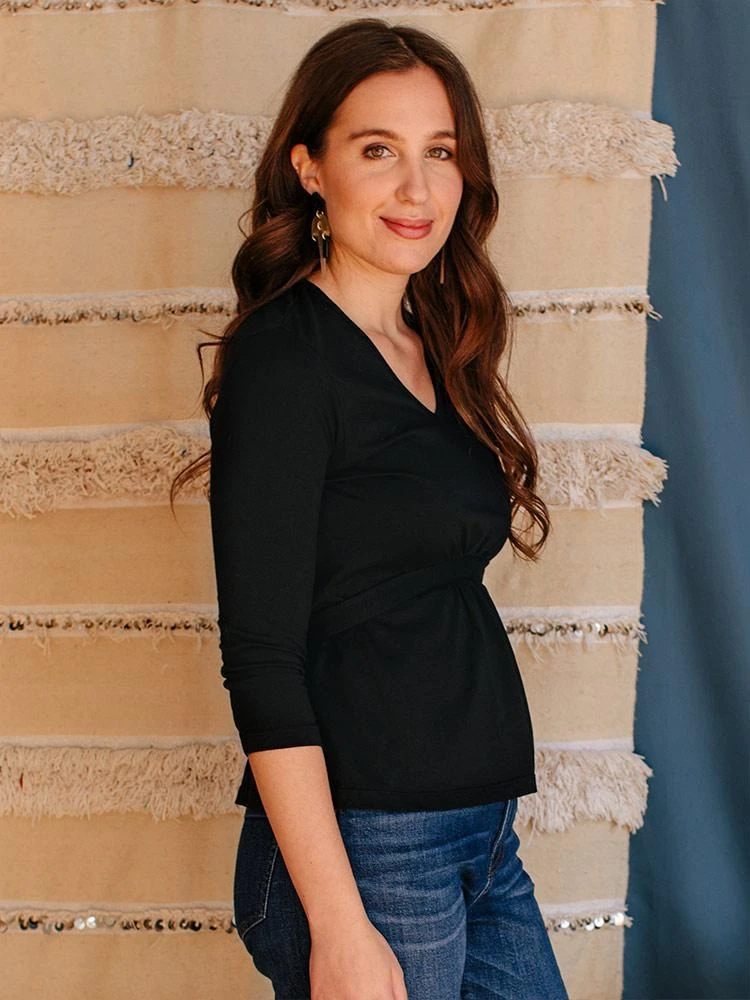 This organic cotton top has a flattering shape. Fitted sleeves and a tie at the waistline accentuate a feminine style.