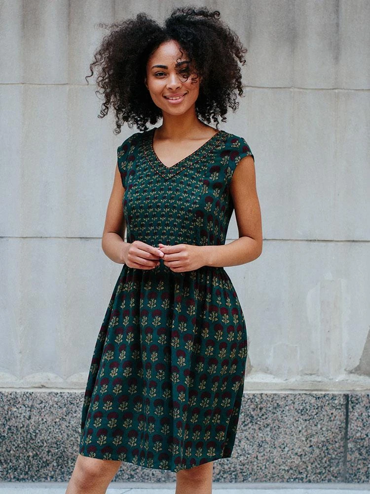 This cap sleeve fit and flare dress features beautiful hand embroidered details, a flattering waist tie, and hidden pockets.