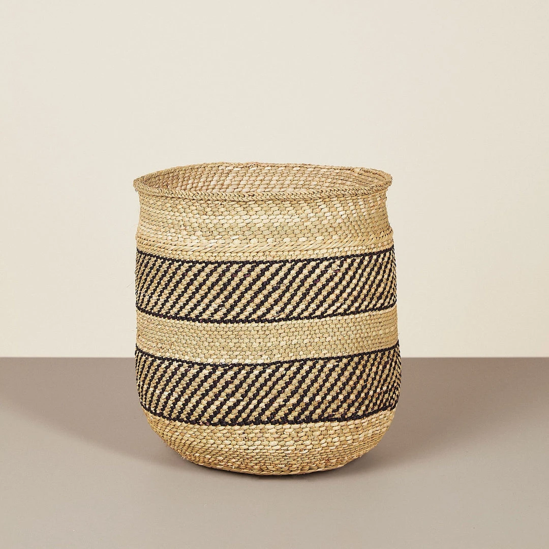 This collection of Iringa baskets features the natural fiber color with the traditional striped pattern in rich deep black achieved by natural plant dyes. Made from Milulu grass which grows wild in Tanzania and woven by women, these baskets give you natural, contemporary style while being completely functional.