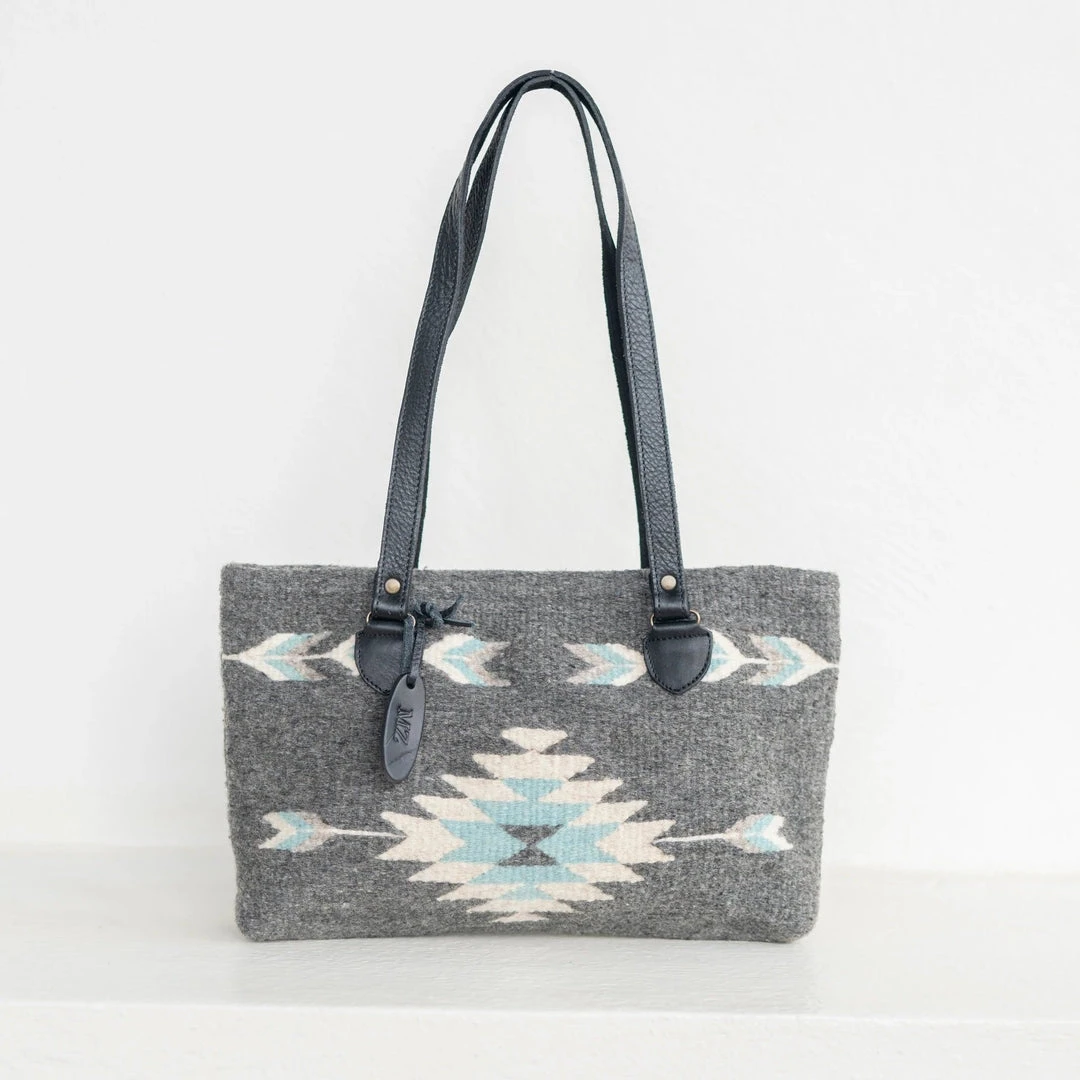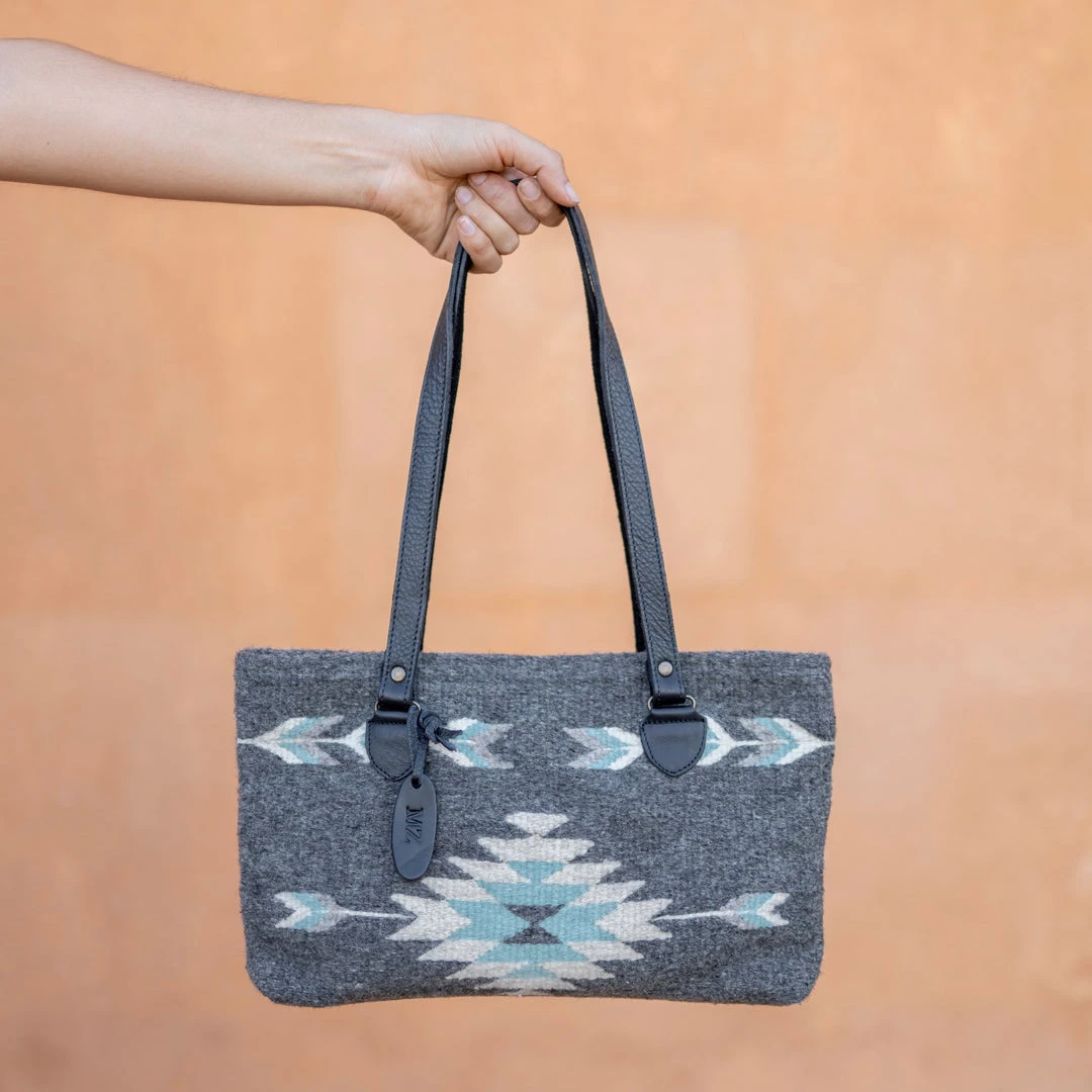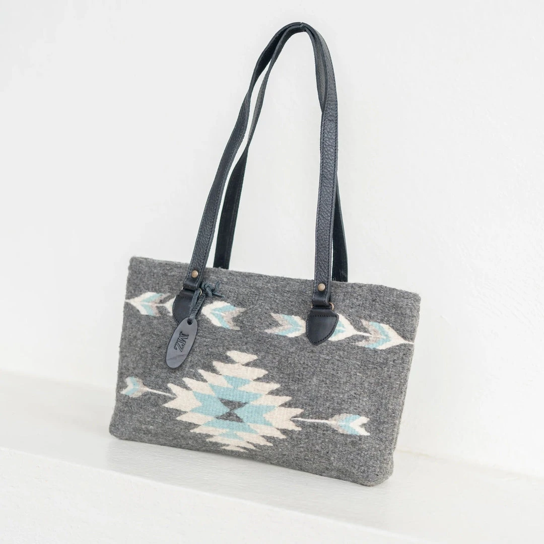 The First Frost pattern features a Zapotec diamond and arrow designs in frosty blue and cream on natural gray wool.