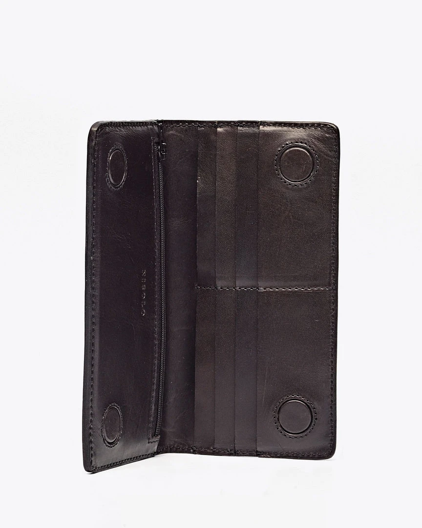 The perfect everyday wallet featuring classic, clean lines and black leather that will stand the test of time and only look better with age. Inside you’ll find pockets for credit cards and cash, a zippered pouch for coins, and magnetic closures to help keep all of your necessities safely in place.