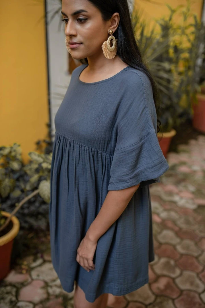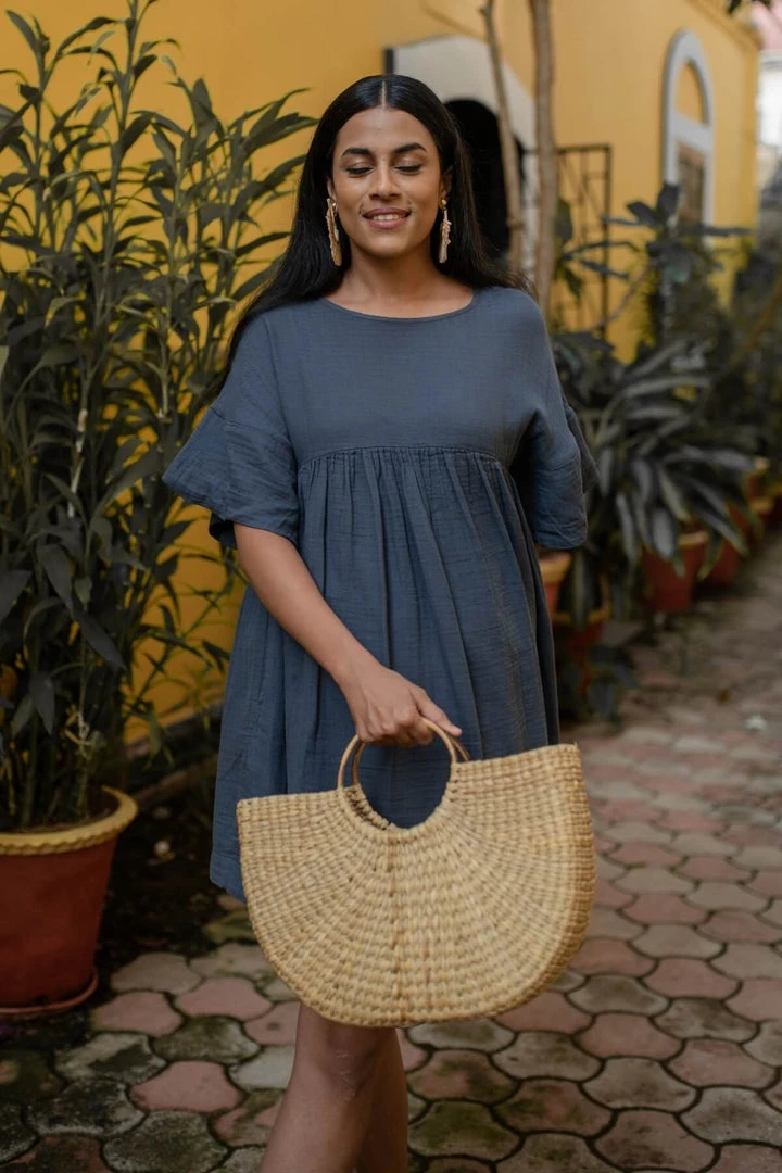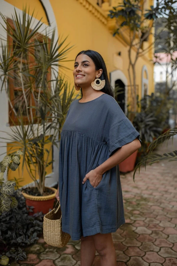 There’s a feeling of real calm and liberation to the Zaragoza scoop dress. Intended to be a casual, universal fit and offered in just two sizes, the rectangular silhouette, bell-shaped sleeves, and soft gathers at the yoke enhance the playful, airy nature of the design. The dress is cut from super-soft muslin, while the inseam pockets are lined with voile.