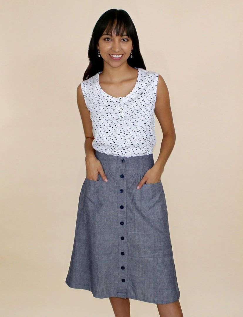 A classic yet unique luxurious chambray midi skirt. The buttons down the front create a clean, sophisticated look that leaves a lasting impression. It also features elastic in the back for your comfort and pockets for extra utility. Your purchase helps provide a secure job with fair wages and a positive working environment for artisans in India and the United States.