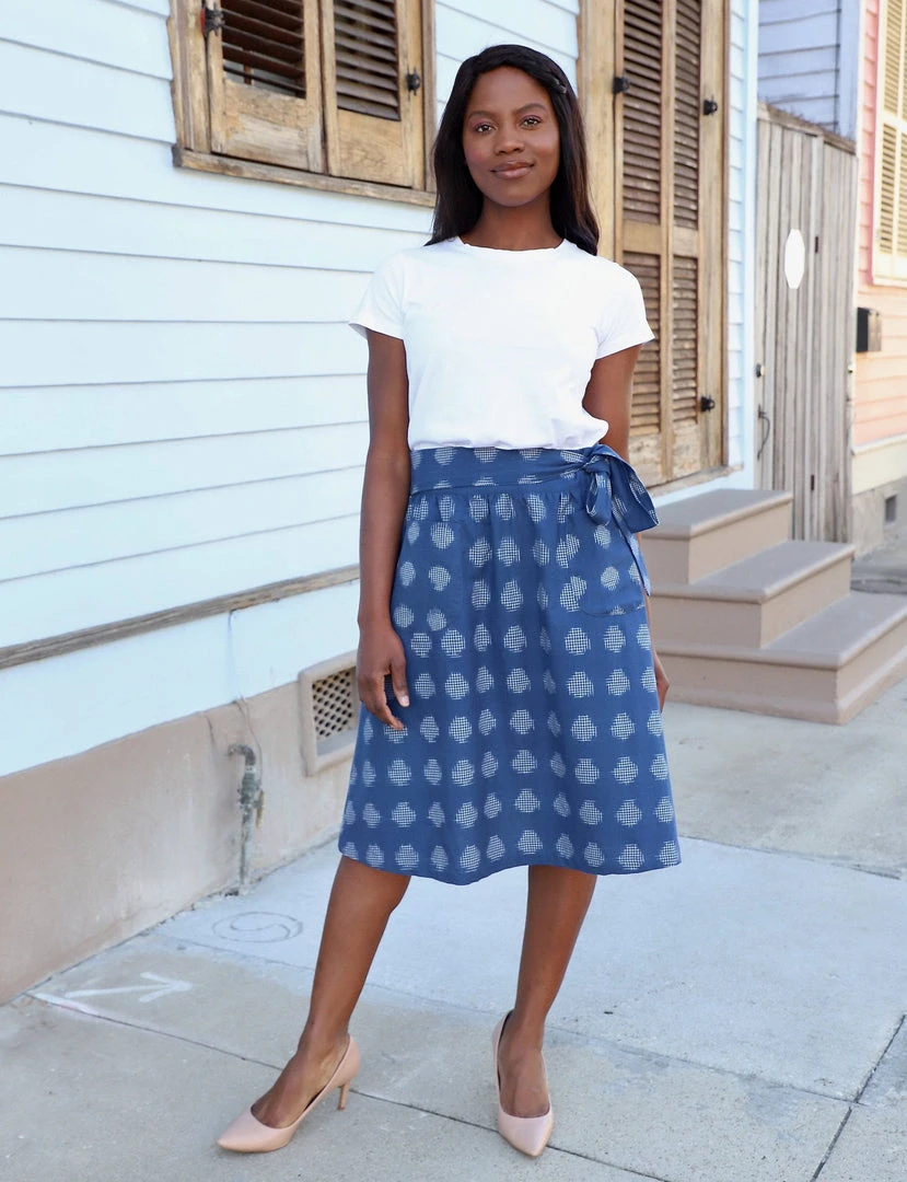 The navy blue and white midi Esmeray pocket skirt is handmade with ikat woven cotton and features ties at the back and pockets in the front. This patterned midi pairs perfectly with solid tops, sneakers or heels and complements all ages. Due to the handmade nature of these products there may be a 5-10% shade variation from the picture of the garment to the actual product you receive.