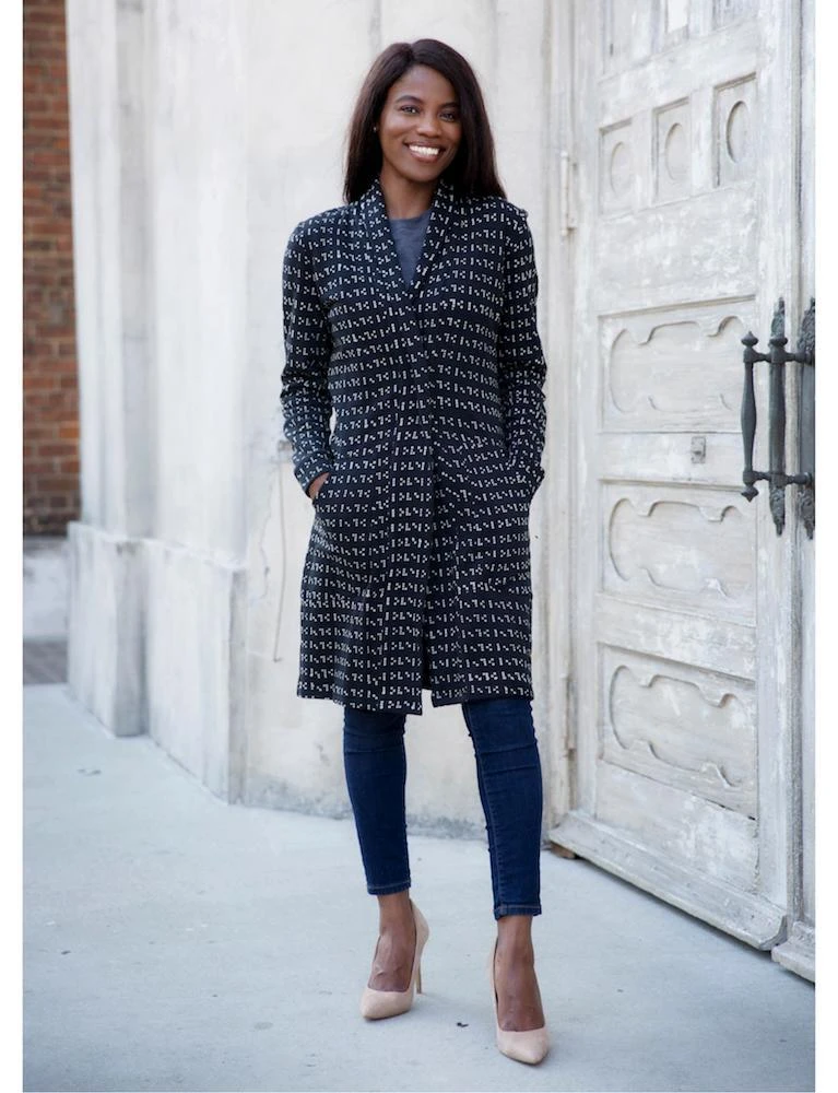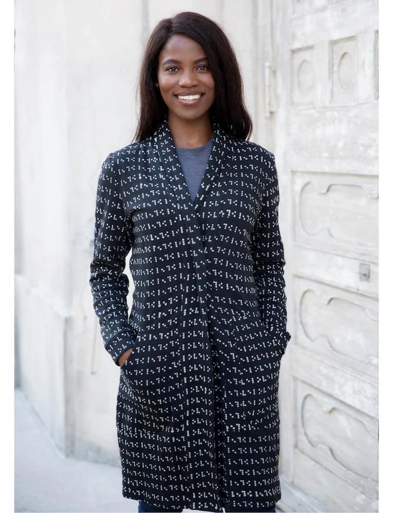 When autumn starts to spread its chill, you’ll thank yourself for buying Love Braille Coat. It’s the perfect throw-on coat for chilly evenings out after work or just for wearing around the house when you want to warm up. This comfy and stylish outerwear works for any day-to-night situation, so you can always walk out the door looking your best. The Love Braille Coat features a geometric white dotted print on black jersey that is braille for love. This coat has nice deep pockets, a front button closure, and a soft collar.
