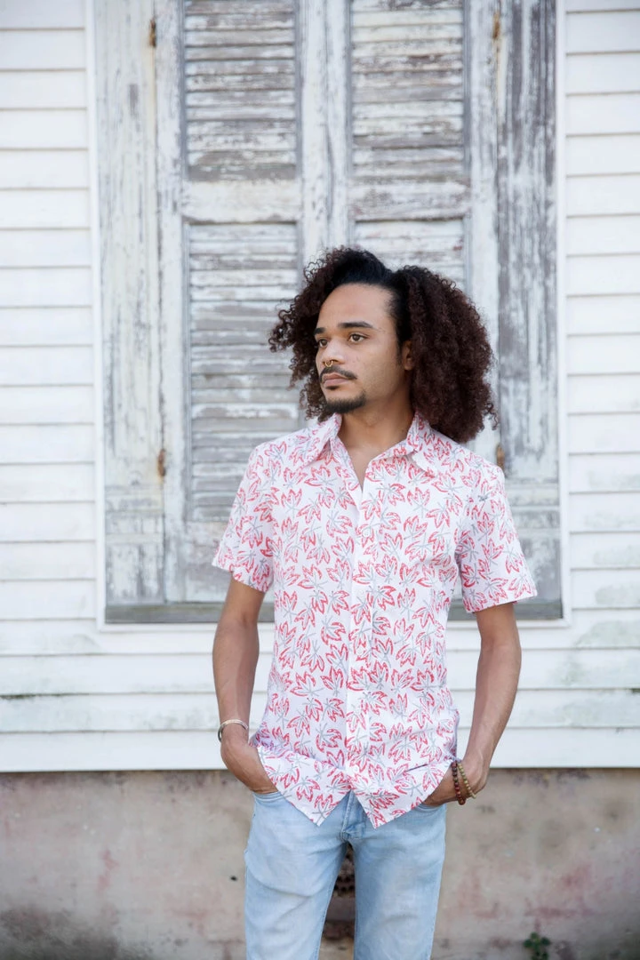 This short sleeve button down features a hand block printed tropical floral print. Gentle tapering at the waist with a straight and narrow profile and a broader fit in the shoulders gives this shirt the perfect fit. Dress this shirt up with slacks for dinner dates or pair with jeans for a polished casual look. Due to the handmade nature of this item, slight color variation may occur.Â