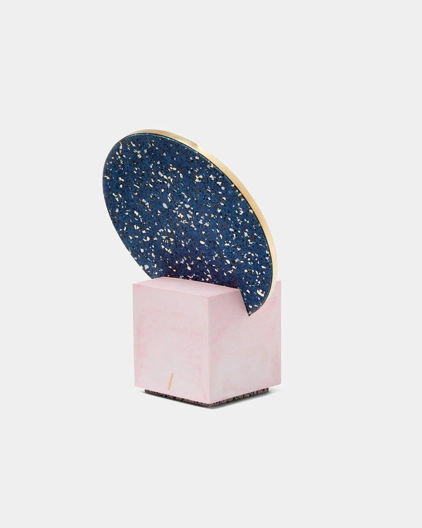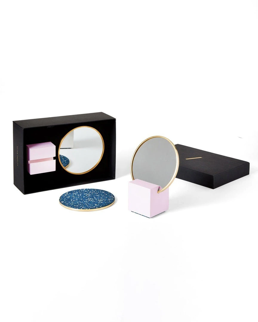 Cube base with 6″ round mirror, brass edges and rubber backing. The perfect addition to your desk or vanity. Packed and shipped in a protective box ready for gifting.