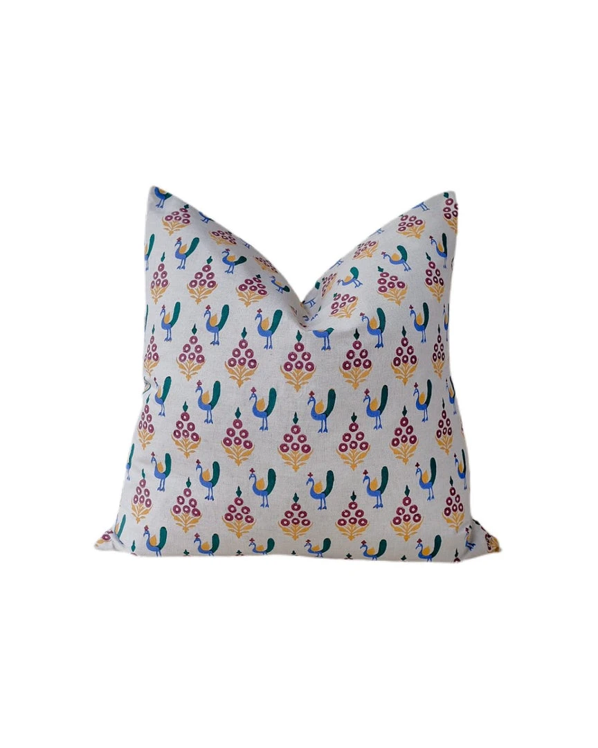 The Vani Linen Throw Pillow is hand block printed by artisans in a small village outside of Jaipur. The bright, joyful design is inspired by the romance and poetic feel of Udaipur. Subtle nuances are to be expected with handcrafted textiles.
