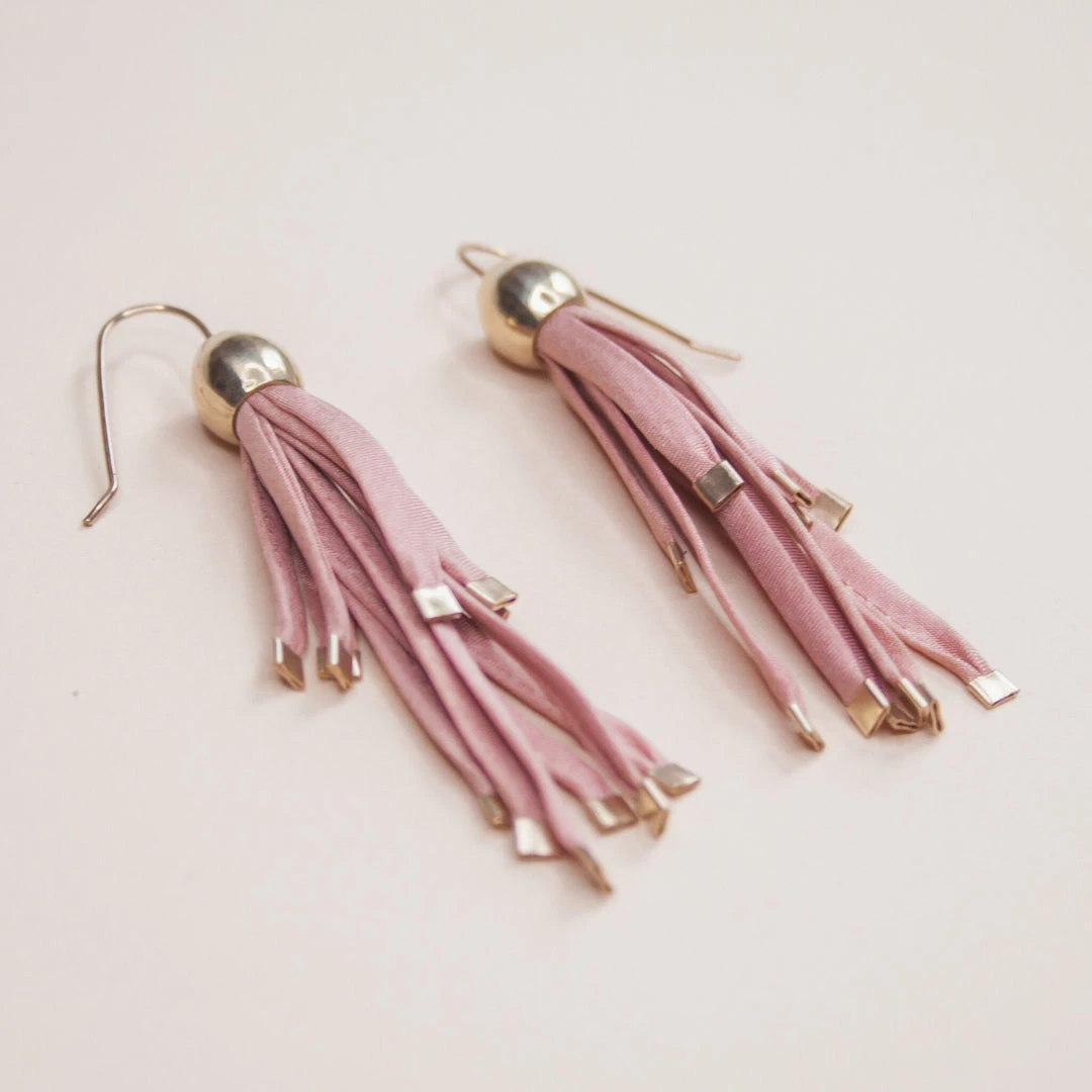 The Pod and Strand Earrings feature two tiers of silk strands falling from a pod of bronze or silver. The design creates a swaying, swinging, movement inspired by a siren’s seaside adornment. Each pair is expertly handcrafted in the California Bay Area. Due to the hand dyed nature of the jewelry slight variations in color are to be expected.