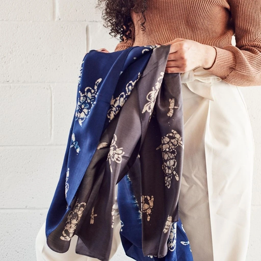 The Oraa Indigo is a classic silk scarf that can be worn as a scarf or a wrap. It is made by master shibori artisans in India. This scarf has been made using wooden blocks and a hand wax printing process which creates a beautiful one of a kind pattern. Classic in design, this scarf is a truly sustainable luxury piece that also supports artisan communities.