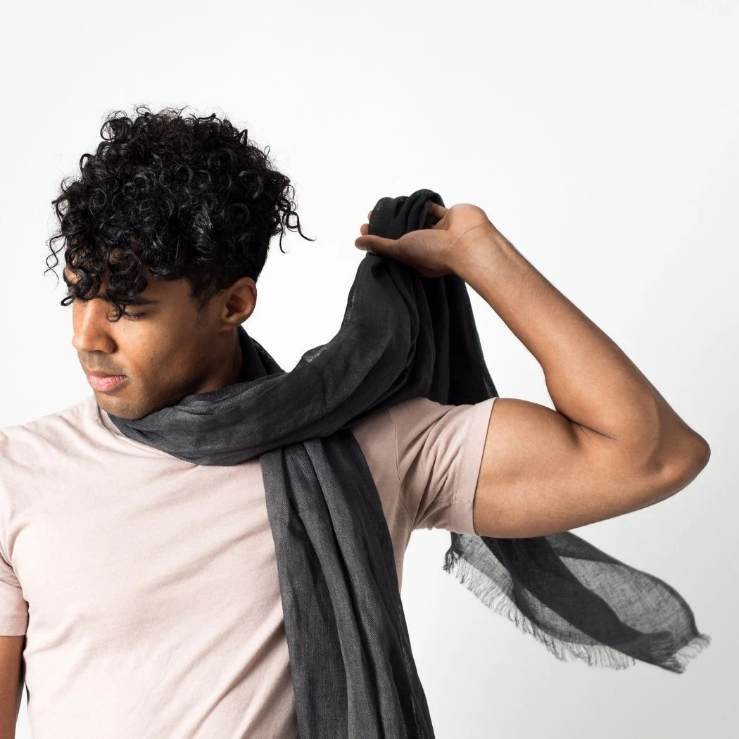 Charcoal is a classic unisex solid scarf which can be worn all year round. Pure linen makes this scarf naturally breathable and light. Eco-friendly yarns add a subtle texture to this large scarf that can be styled in multiple ways. Comes in an individual cotton envelope shaped pouch made by the same artisans that crafted the scarf. This keeps production inclusive and packaging sustainable.