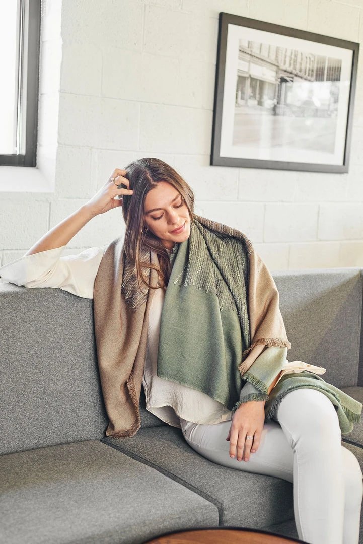The Salvia Merino Blanket’s hand-embroidered pattern is textured on one side and subtle on the other, making it reversible and versatile to arrange and use. The carefully applied pattern and short fringes provide a minimal, modern look.