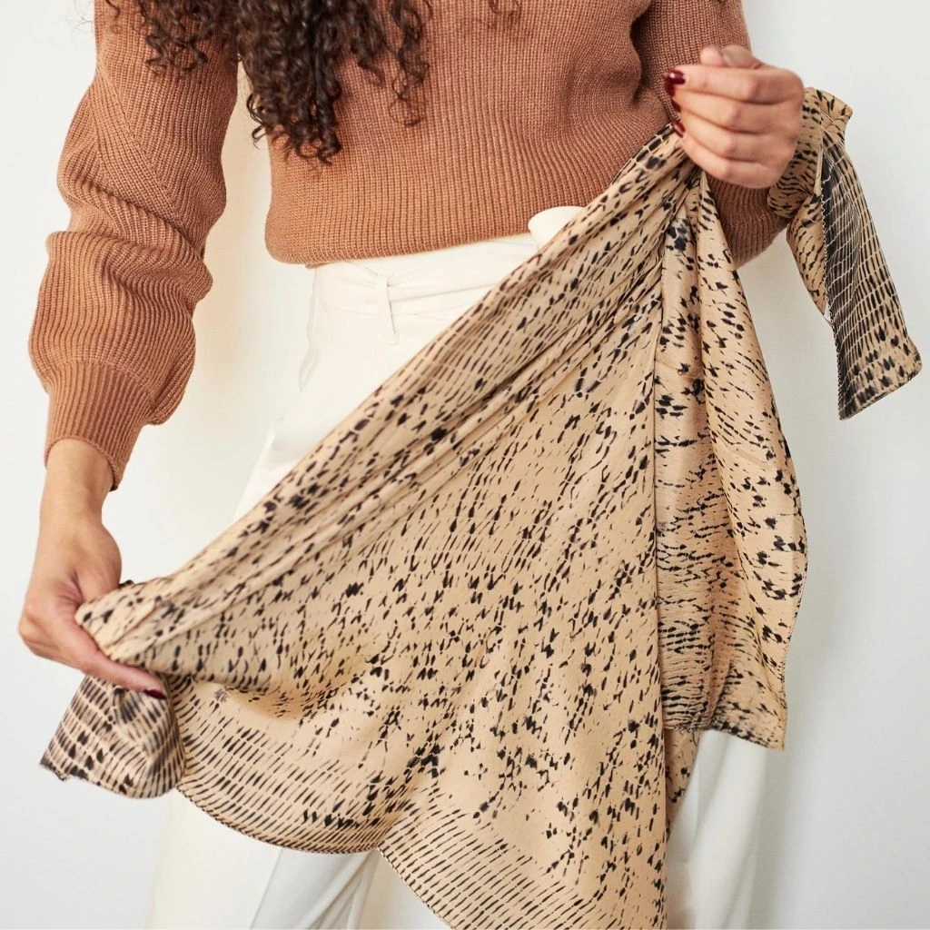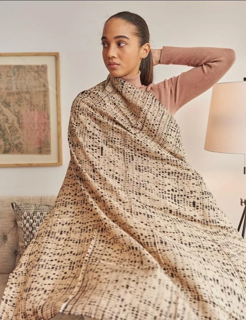 This beautiful silk scarf is a piece that offers modern elegance and timeless quality to any outfit. The seams of this silk are finished to give it a clean modern look. Tight winding of fabric creates the stripes pattern. The base color of the scarf is created by using dyes made from the acacia tree.
