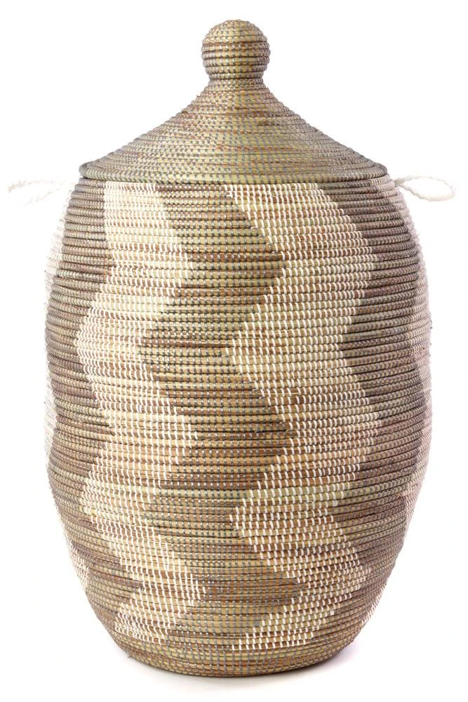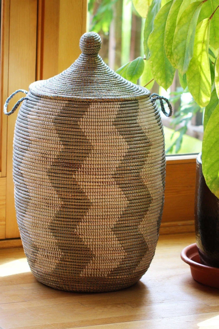 The laundry hampers are handwoven by an association of more than 100 rural Wolof women in the West African nation of Senegal. Each basket is woven in the coil style by binding dried cattail stalks with plastic strips salvaged from a Dakar mat factory.