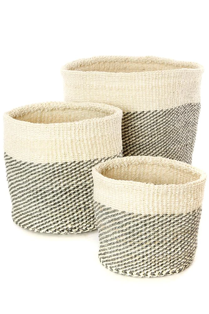 This versatile set of nesting baskets is handwoven by talented rural Kenyan women using strands of natural and hand-dyed sisal. The baskets are coveted for their ability to be re-shaped, as well as their durability and all-natural composition.