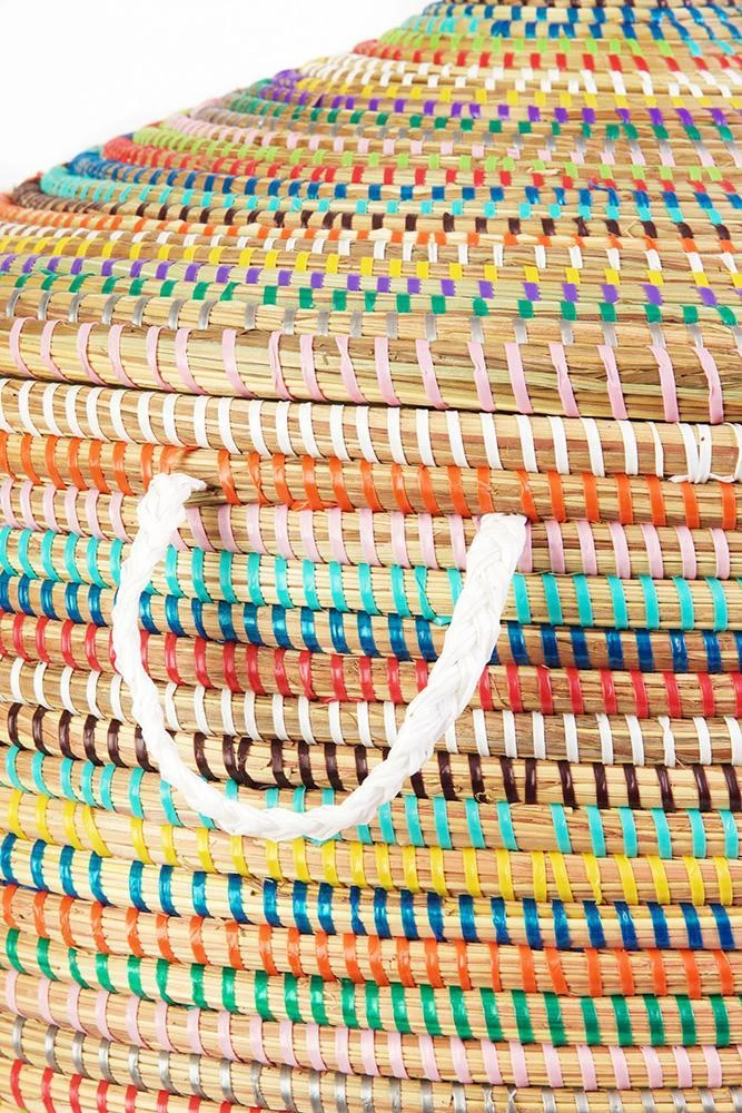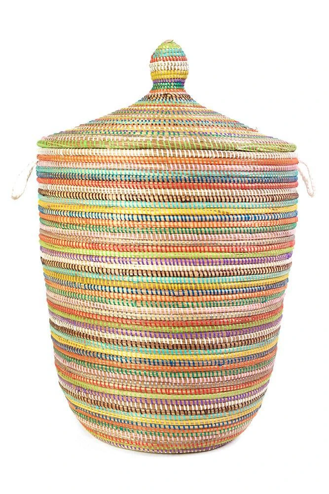 These durable, beautifully crafted baskets brighten any room of your home while providing an impressive amount of storage. This laundry hamper is handwoven by an association of more than 100 rural Wolof women in the West African nation of Senegal. The artisans hand-weave each of these hampers using abundant and renewable cattail stalks bound with salvaged plastic strips procured from a local mat factory. These handcrafted baskets may vary slightly as compared to the the photos, as each set is unique.