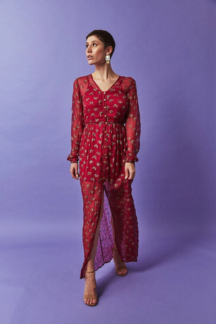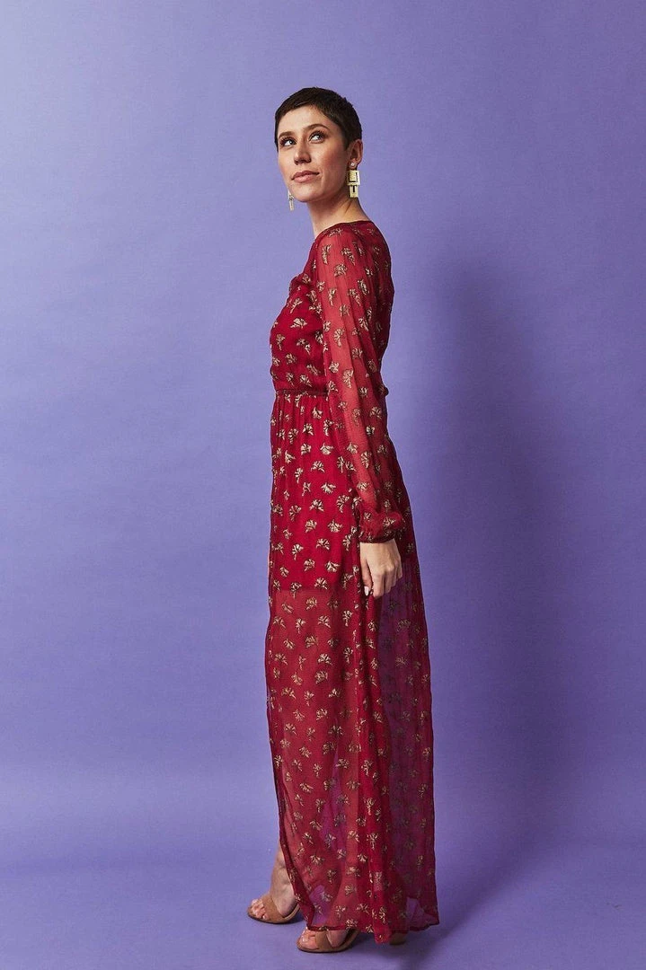 Talk about making an entrance. Block printed in a stunning Gingko Leaf pattern, a sultry chiffon maxi is sure to turn heads. Complete with a stretchy slip dress, this stunning number is perfect for a gallery opening or Spring wedding.