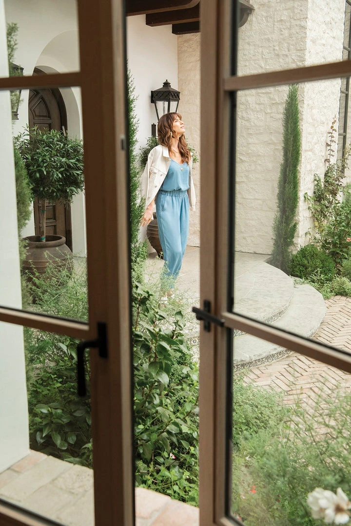 Not your average jumpsuit, the Crisp + Cool Jumpsuit features a mandarin collar, a flat front elastic waist, and unique cropped legs with 6″ side slits.