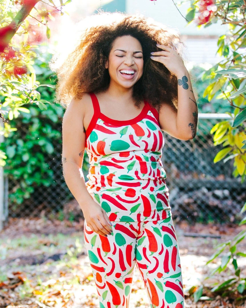 This hot pepper cami is cut with wide straps to cover your bra. This is a snug but modest camisole in super soft organic cotton/spandex. You can wear this on its own as a top or team up with the Hot Pants Original Underwear for a nice set. It’s especially comfy to wear to bed or for lounging about in.