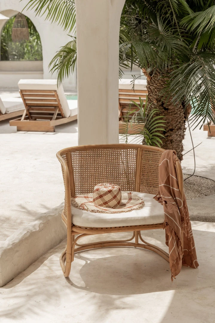 Keep the sun off your face and out of your eyes with this hand woven sun hat featuring an elegant plaid pattern and playful, frayed edge.