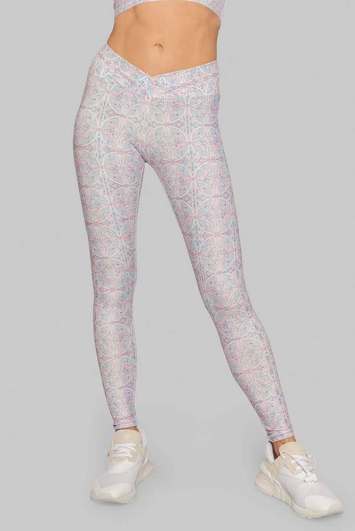 Wolven’s classic legging with an ultra-comfortable crossover waistband and silhouette-defining ruching in back—so flattering. With a nod to Spanish architecture, Riviera features an ornate portico-like print with a pop of coral.
