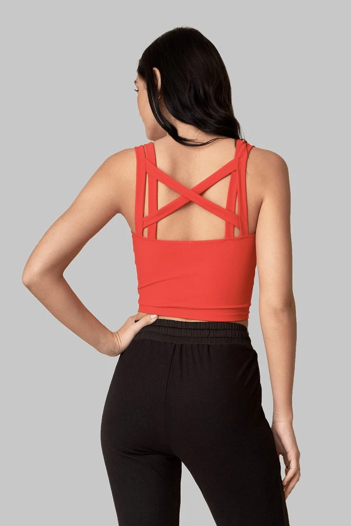 This warm, vibrant red is here to turn up the heat and be your future power color. A longer crop, this style offers mid-length coverage. Tuck into matching leggings or bike shorts to create a onesie silhouette. After yoga, throw on your favorite denim and rock this style as a cute crop top. Featuring double straps in the front and criss-cross straps in the back, this top is the perfect blend of comfort and style.