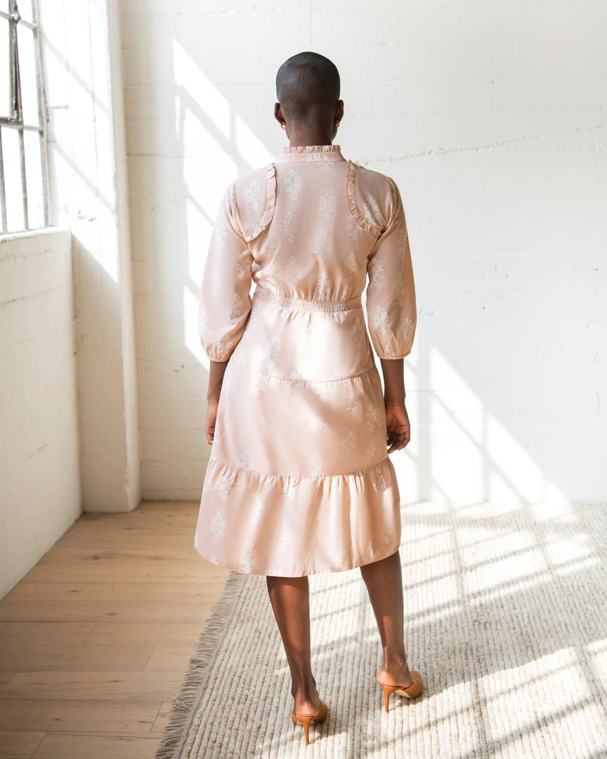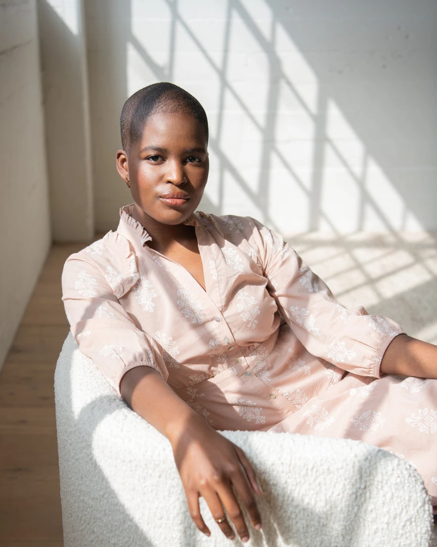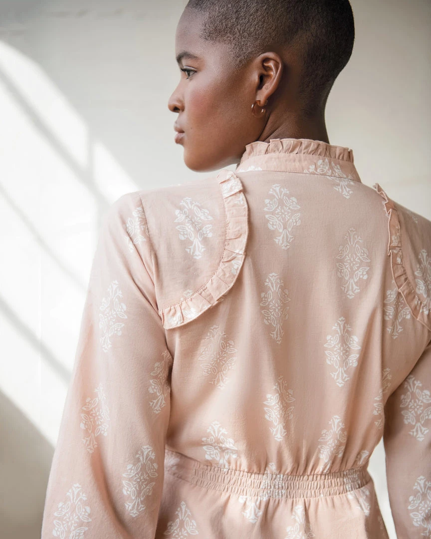 An artful and elegant addition to every woman’s wardrobe. The Aurelia Dress, accented with coy ruffled details at the collar and shoulder, is meticulously tailored and hand-printed with a floral block-print design. Falls just below the knee and made from organic cotton voile.