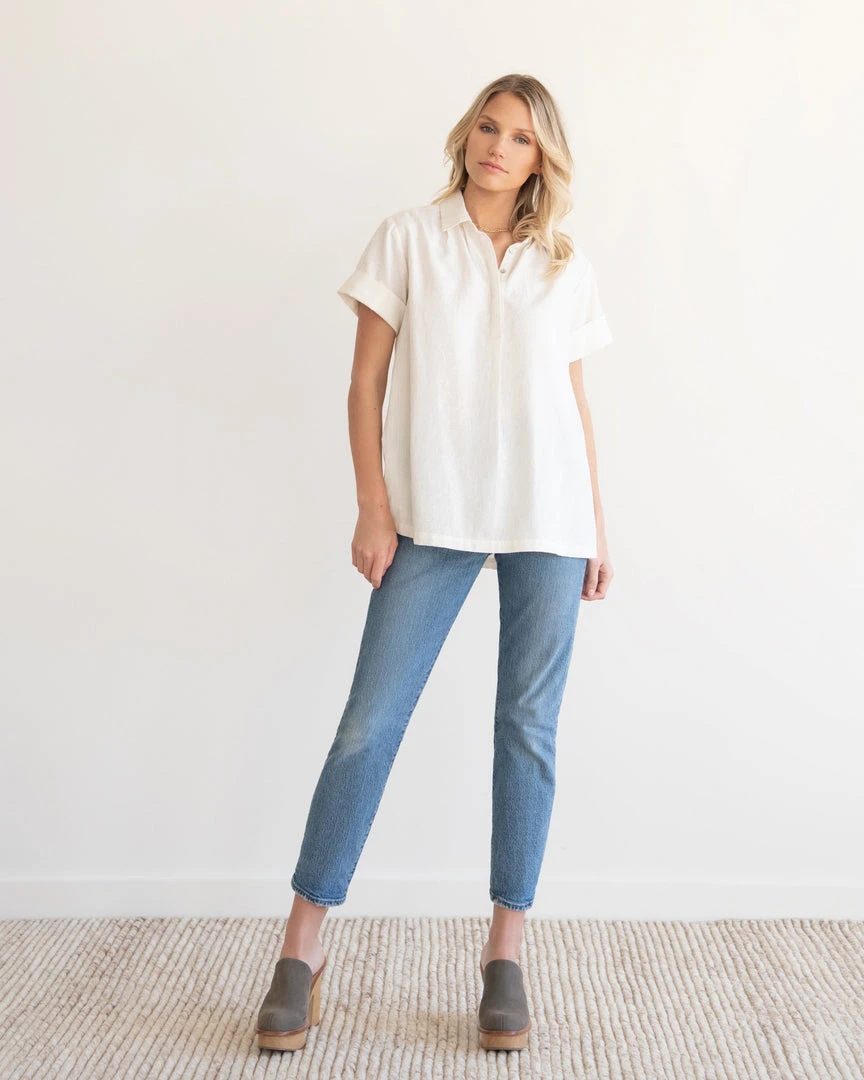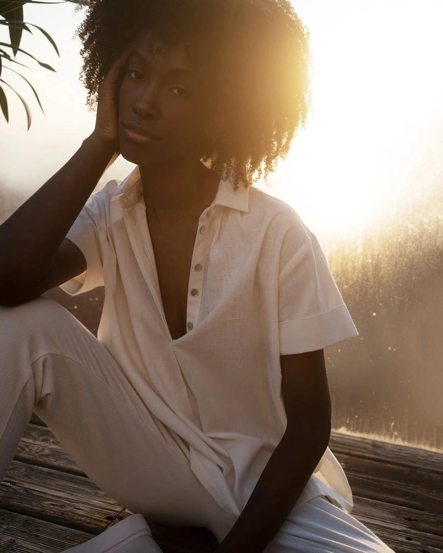 The Bailey Top is made from hand-spun organic cotton khadi, a heritage textile that traces its roots back to Gandhi’s work in India. A timeless, minimalist-inspired piece featuring wide-cuffed short sleeves and a notched-collar, finished with delicate shell buttons.