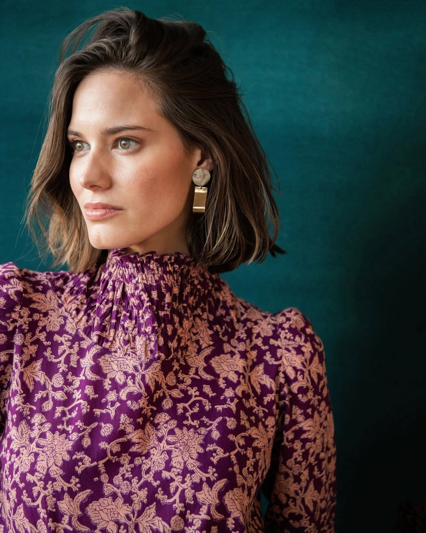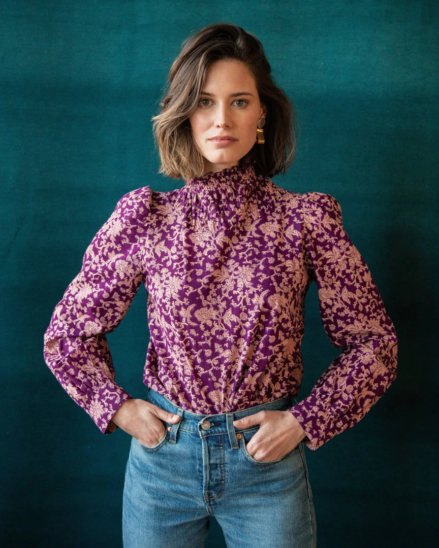 With a smocked, high collar and rich rosy palate, the Delphina Top marries classical influence and modern construction. Features delicate ruffled detailing, slightly puffed sleeves, and a romantic floral print.