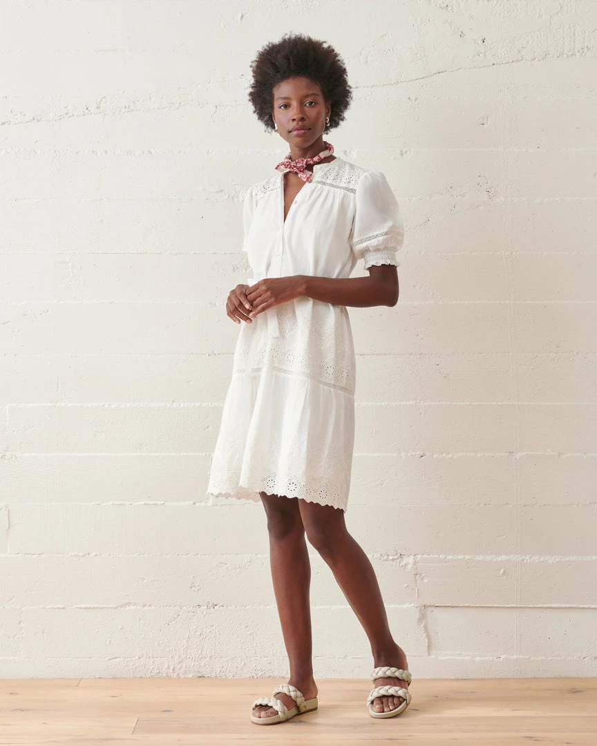 This dress gracefully falls just below the knee with a delicately belted waist and elastic shirring at the cuffs, creating a charming billowed effect. Crafted from clean, crisp, organic cotton, this is a lightweight timeless spring to summer piece with delicate eyelet details.