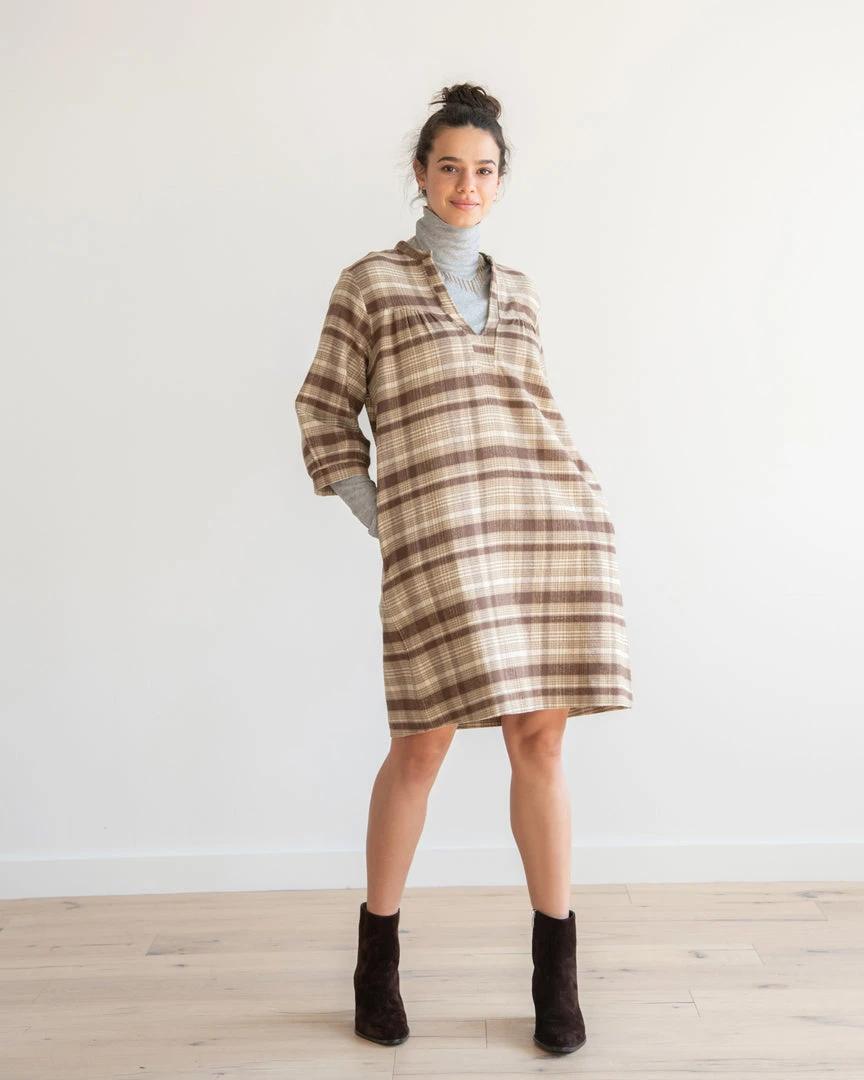 A clean palette of warm neutrals with an earthy plaid print, this carefree shift dress features a notched v-neckline and dainty puckering along the collar and at the sleeves. A statement in simplicity that will take you from season to season.