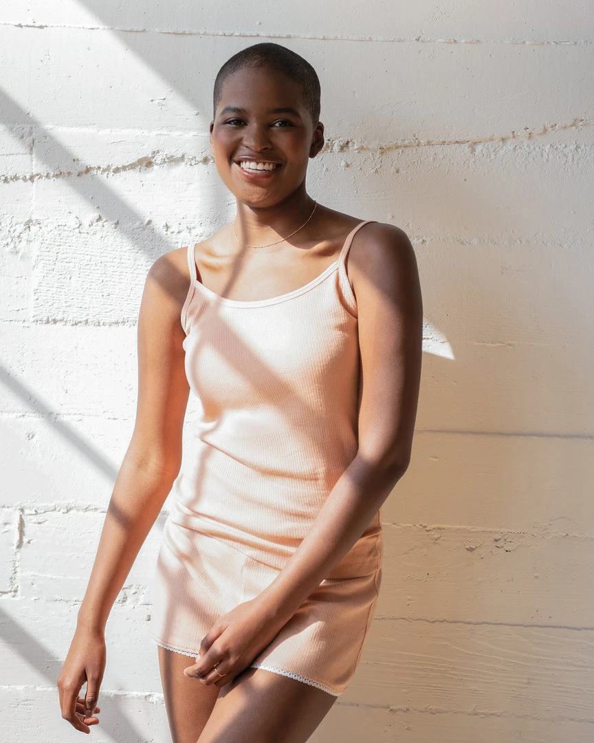 The Vintage Camisole is made with soft, fine-rib organic cotton. It was designed to be the ideal layering piece or worn with the Bonsoir Sleep Short for rest and relaxation at home.