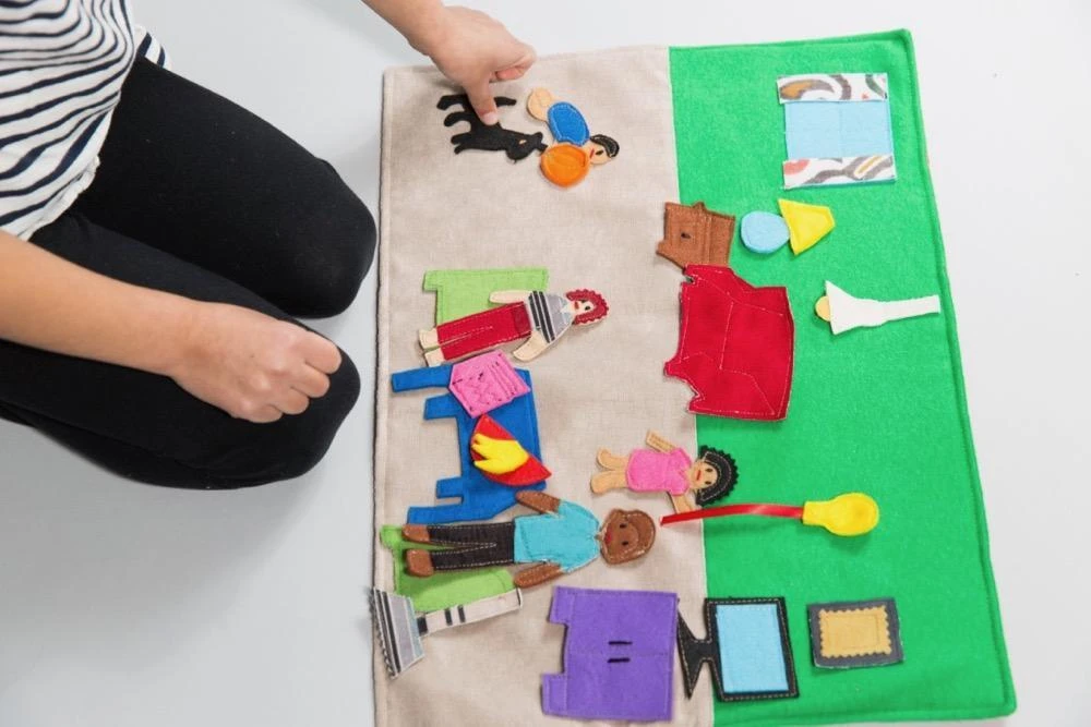 The Family Storyboard allows children to tap into their imagination to create their own story about a family while learning spatial relationships, discover elements of the home, and explore family relationships. This Storyboard comes with people, furniture, and object pieces that are commonly found in the home. The play mat rolls up and comes with a cotton carrying case for small pieces, making it compact and portable.