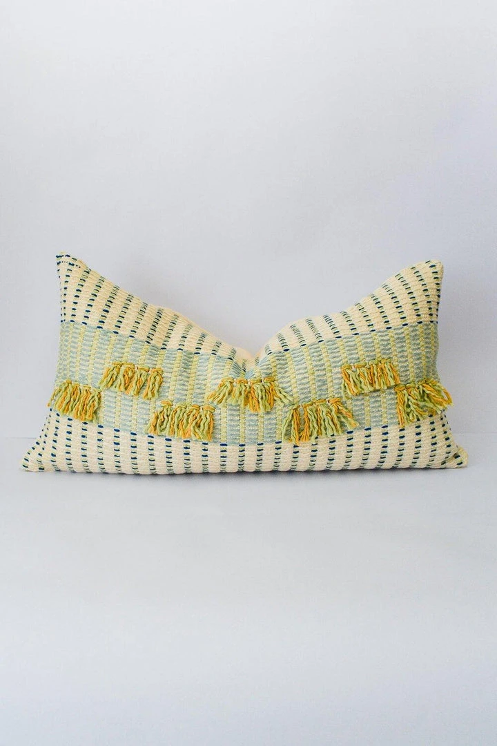 This lumbar pillow is inspired by the rhythms of the streets of Barichara. Designed as a long decorative pillow, tassels decorate the central panel of this weave, making it a perfect one piece accent for a living room or a bedroom.