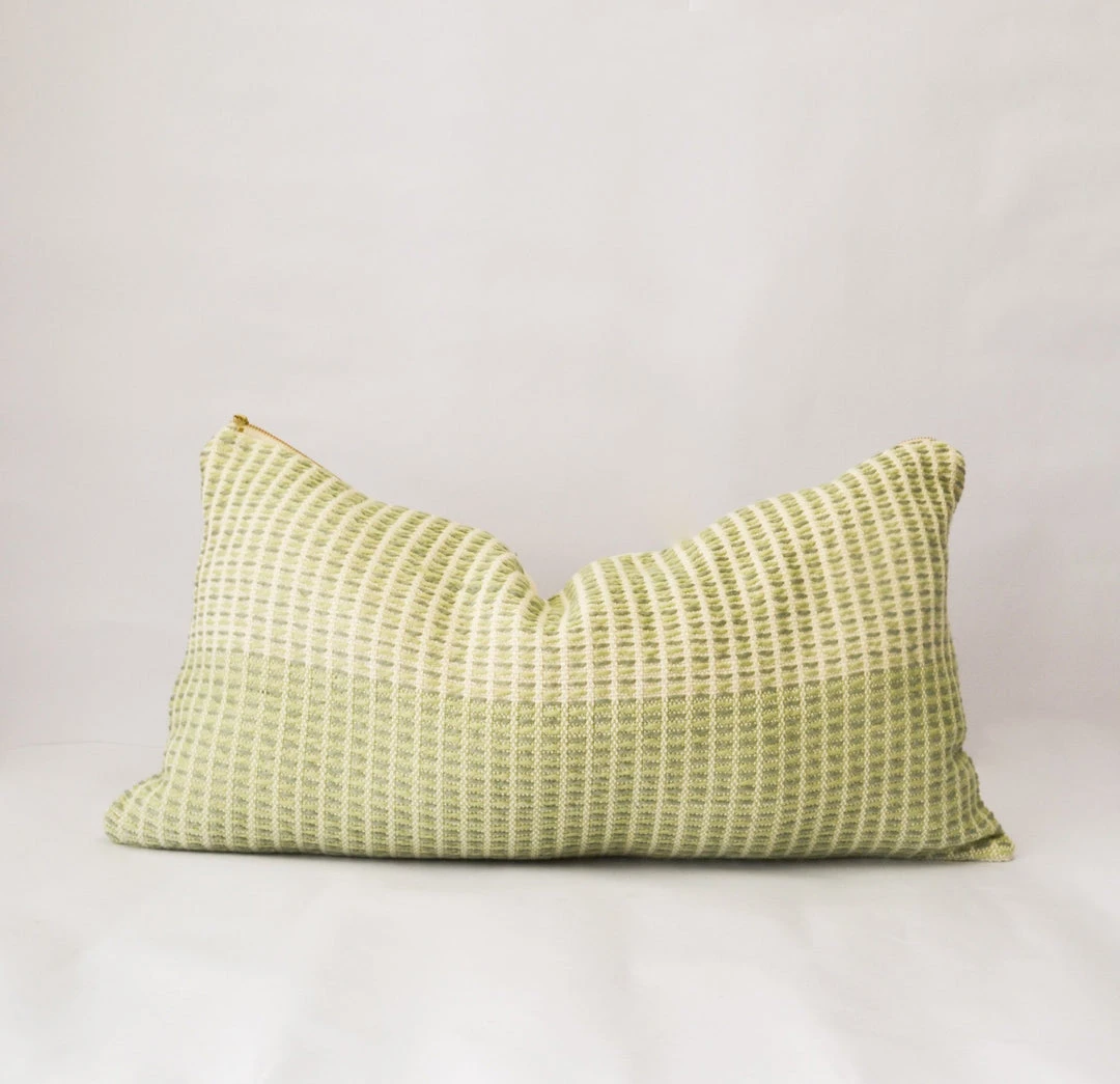 The Feijoa is a small green fruit that tastes like pineapple, mint and apple altogether. This two-toned lumbar classic striped weave in mint green and cream, is a sophisticated simple addition to bring freshness to any room. The softness of seaglass and mint help create a beautiful subtle color combination perfect for any season.