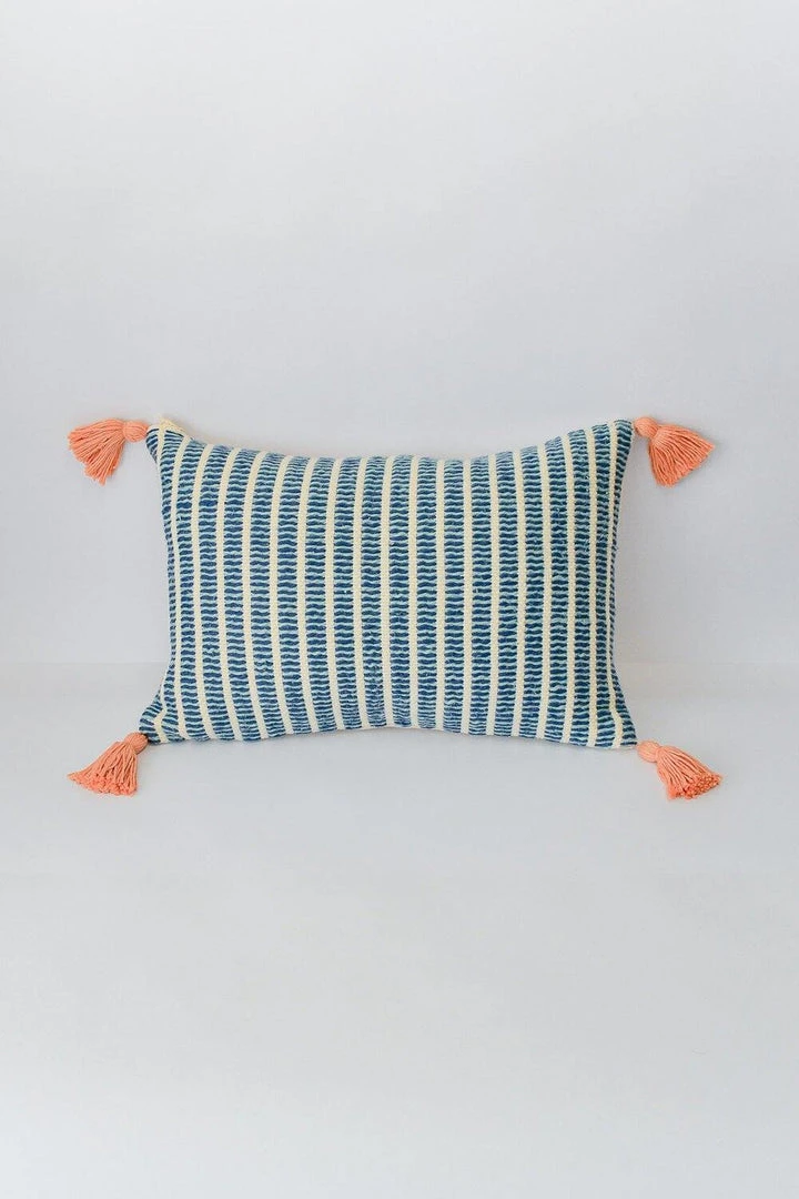 This adorable toss pillow features a soft weft-float weave in bold colors with corner tassels as accents.